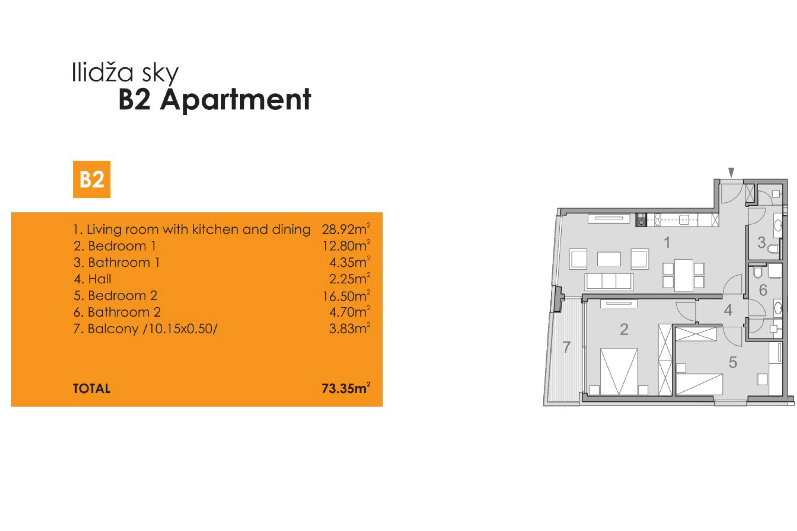 Nekretnina se sastoji od dnevnog boravka u čijem sklopu je kuhinja i trpezarija, dvije spavaće sobe, dva kupatila, toaleta, degažmana, predosoblja i balkona.