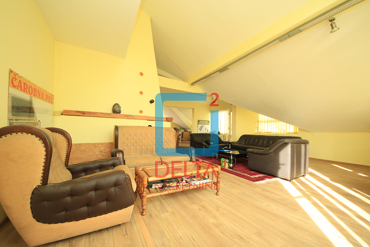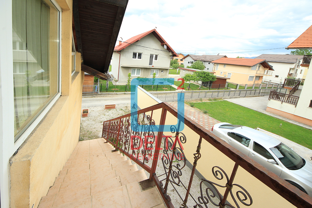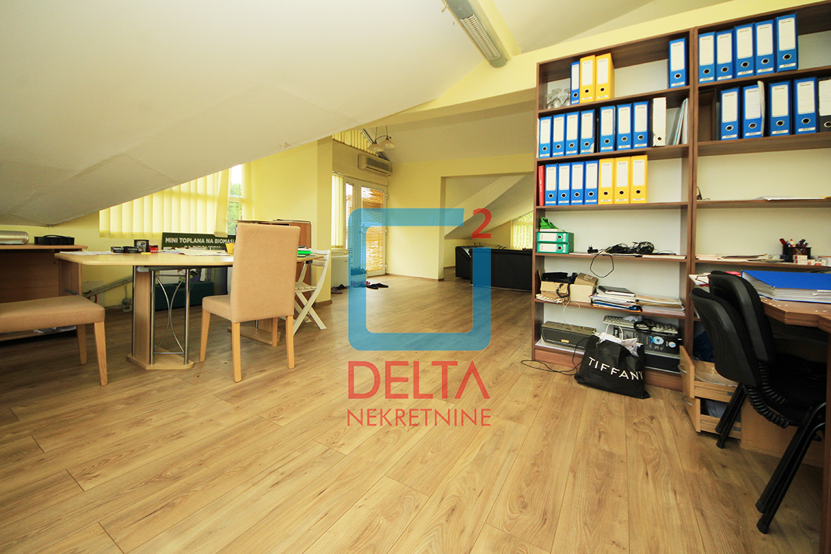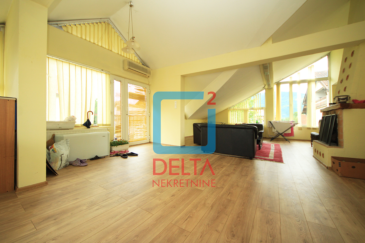 Stambena površina koja se nalazi na prvom spratu kuće sa zasebnim ulazom iznosi 200m2 i sastoji se od dvije spavaće sobe, kupatila, prostranog „open space“ prostora u sklopu kojeg se nadopunjavaju kuhinja, dnevni boravak i mala radna soba, te „open space“ prostora površine od 100m2 koji može biti korišten kao kancelarijski prostor uz blage prerade. Nekretnina posjeduje i dva velika balkona.