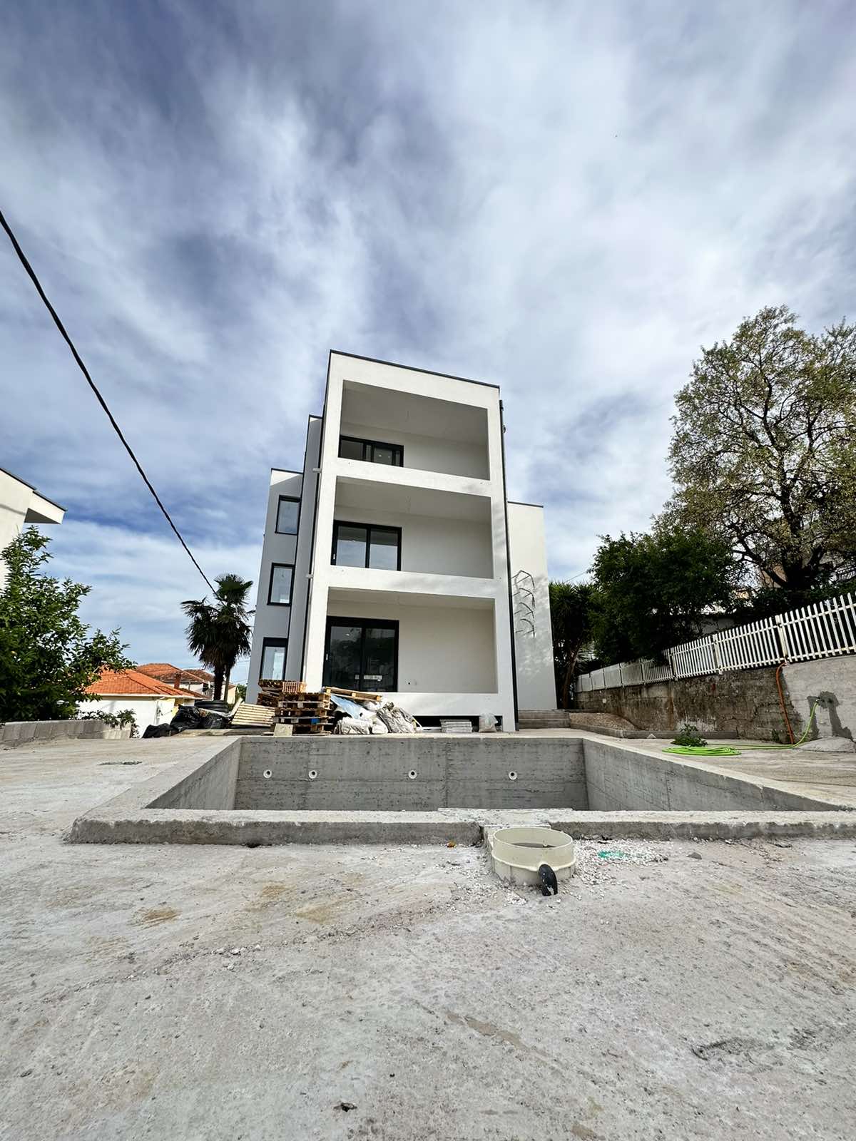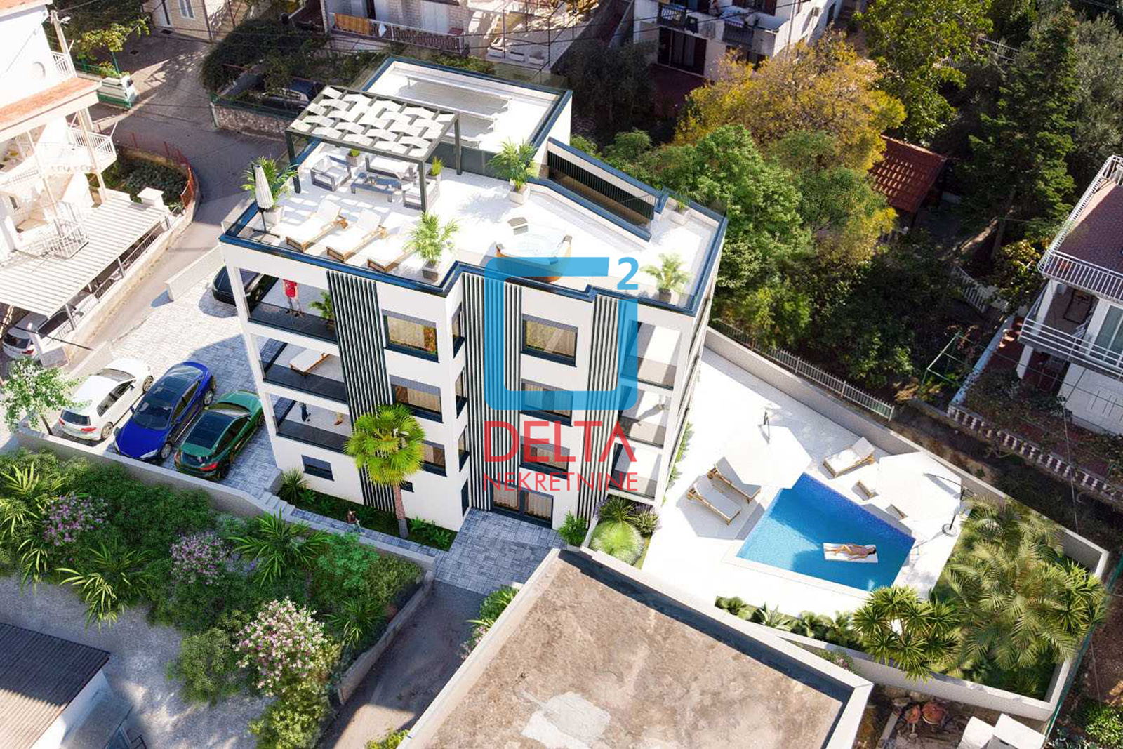 Sa jedne strane zgrade nalazi se bazen, a sa druge parking prostori za apartmane.
